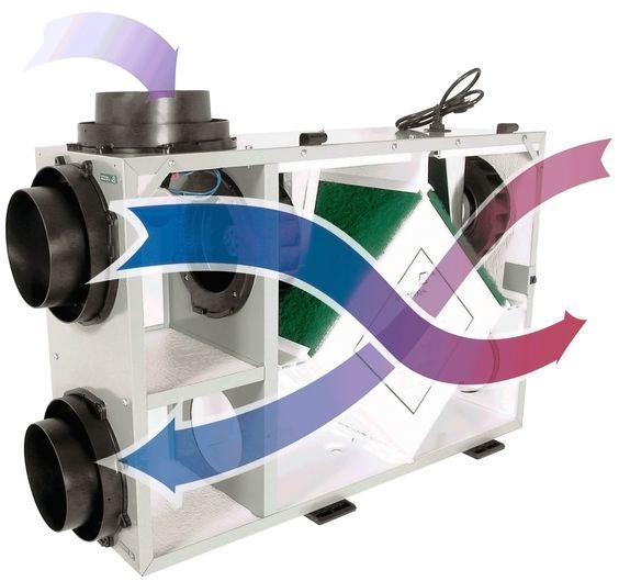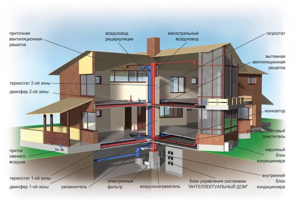 Воздушная система отопления дома работает по принципу: калорифер (обогреватель), электрический, либо работающий на твёрдом топливе или природном газе, находится в подвале дома. Воздух забирается с улицы проходит через калорифер систему фильтрации, подогреваемый зимой и охлаждённый летом, распределяется системой воздуховодов по всем помещениям дома, предпочтительно под окнами, чтобы перейти точку росы.